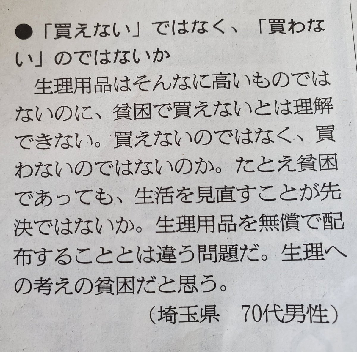 生理の知識もないのが丸わかり。こんな無知投書をさも得意げにやるジジイがいるんだねー。買わないで済むわけないじゃん生理。買えないんだよ。 https://twitter.com/junesea3/status/1401378553015377922 …