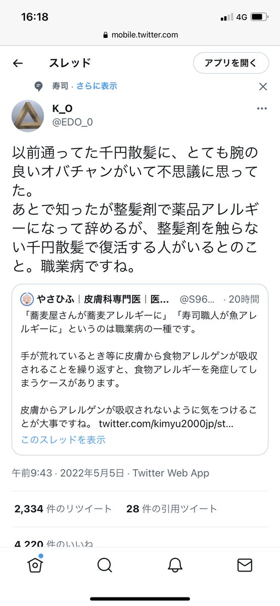 あとで知ったが整髪剤で薬品アレルギーになって辞めるが、整髪剤を触らない千円散髪で復活する人がいるとのこと。職業病ですね。 https://twitter.com/S96405539/status/1521810471602380801 …