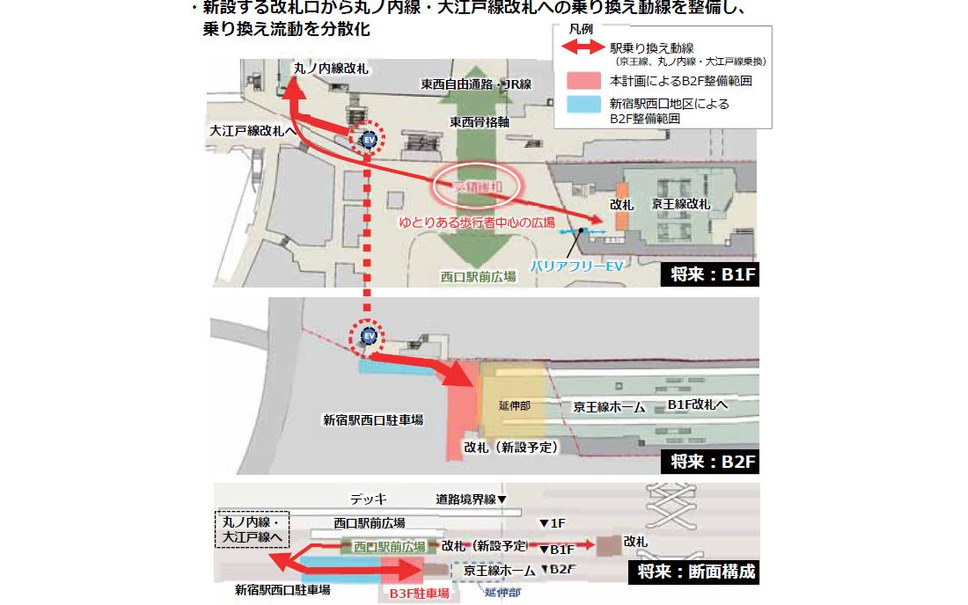 鉄道については、東京地下鉄(東京メトロ)丸ノ内線や都営地下鉄大江戸線への乗換え動線の分散化などが含まれており、合わせて、京王電鉄(京王)京王線の構内延伸や改札の新設、京王線ルミネ口の拡張が図られる。