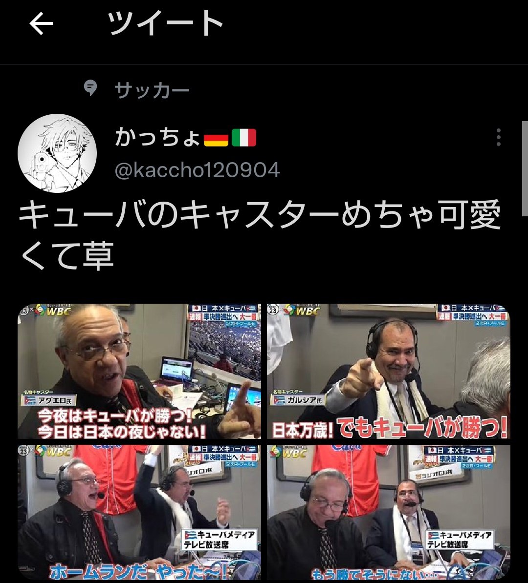ツイッター 【朗報】キューバの野球キャスター、めちゃ可愛い writer11 2022年9月13日 / 2022年9月13日 かっちょ????@kaccho120904キューバのキャスターめちゃ可愛くて草 pic.twitter.com/mWUphSTh2G2022/09/10 12:31:36 強炭酸バナナオレ@aotaburetto@kaccho120904 純粋に野球を楽しんでそう2022/09/10 20:27:37 斧将軍@onoshogun@kaccho120904 主義思想や国家の枠を超えたコミュニケーションのきっかけは、こういうところにあるんだと思う2022/09/10 19:05:39 せいしん@magictokumecha1@kaccho120904 @vn2XbLY27ziwUzo 2枚目の態度を見習っていきたい2022/09/10 19:06:11 氷川よみ@怪文書とふんわり絵が致命傷@tukuyomi_MeT@kaccho120904 この間まで隣国アメリカと国交断絶してたとは思えないぐらいオープンで社交的で草2022/09/10 18:44:47 ʚ侮蔑ちゃんɞ@disdain_chan@kaccho120904 他国に敬意を払いつつも、自国をのチームを信じ勝ちにこだわる彼ら好きやわ2022/09/10 18:28:43 鈴木健介@OUcgkQE6HLgEfdy@kaccho120904 楽しそうでよき!最後しょんぼりんぬよい!2022/09/10 18:24:12 おさしみ@osashimi812@kaccho120904 しょんぼりしてて可愛い2022/09/10 18:14:15 LIL.@dr_qrmc@kaccho120904 可愛すぎw2022/09/10 18:13:49 ❥ ✟眠✟ ❥@usatyan56@kaccho120904 もう勝てそうにない、が可愛い!!2022/09/10 18:03:43 ツイたろーず@ironnajibun@kaccho120904 急場を凌げなかったと…2022/09/10 17:38:11 星のおじん様@hosinoojinsama@ironnajibun 野キュウバかり見てそうだね、、2022/09/10 17:44:51 AALIAH@AC00ARETHA@kaccho120904 対戦相手もリスペクトして楽しんでいるのがよくわかる2022/09/10 17:23:40 しおん??@nya_nya_nya_3@kaccho120904 守りたい、この笑顔ACジャパンはこの活動を支援しています2022/09/10 17:23:30 ヴァイパーニキ@0518_wolca@kaccho120904 @Churchill1107 VCT見てる時のワイヤん2022/09/10 17:16:03 hallei彗星@HalleiSuisei@kaccho120904 キューバ「勝ったな。風呂入ってくる」とか言ってほしいw2022/09/10 17:05:00 Noばっしぃ!@HermesBird0932@HalleiSuisei @kaccho120904 「さーてとwどうなって……あれ?」まで入ってたら完璧2022/09/10 18:26:08 ウマじこみ@前田攻略のイベント、ありがとうございました!@umajikomi@kaccho120904 可愛いww 元気だな〜2022/09/10 17:01:49 あほ毛@ahogedayoo@kaccho120904 すきw2022/09/10 16:59:26 じょあちん@joachim_390@kaccho120904 完璧すぎるw2022/09/10 16:57:36 あきたん@akitantw2@kaccho120904 自分の国が大好きなの見て取れて憎めない他人の足引っ張るんじゃないところがいい2022/09/10 16:53:56 レイ@純子@MrR38264270@kaccho120904 好きになりそうwww2022/09/10 16:42:37 猫@GodActsCat@kaccho120904 すげぇ。キューバのキャスターは日本語も喋れるのか2022/09/10 16:42:37 もりがさ しずな??@karakasa_zingai@kaccho120904 サッカー??? pic.twitter.com/gfMfwDcRaO2022/09/10 16:29:54 Nozomu 21 @勉強垢@physici15238337@karakasa_zingai @kaccho120904 サッカーにホームランはないから野球かとおもふよ2022/09/10 19:21:14 ShirD#3(‘ω`)ヘイ@shird_oneblue@kaccho120904 母国愛がすごく良いもちろん良い意味でです????2022/09/10 14:44:39 砕いたらむねの欠片@ramu_ne_dayo@kaccho120904 かわいいww2022/09/10 16:29:15 すじこ(よくリプにいる人)@Sujixo_7@kaccho120904 最高な人じゃんw2022/09/10 16:26:39 あっと@atto__7@kaccho120904 可愛すぎだろ2022/09/10 15:25:01 まきた@anabanmaki@kaccho120904 楽しそうやなあ笑2022/09/10 15:46:57