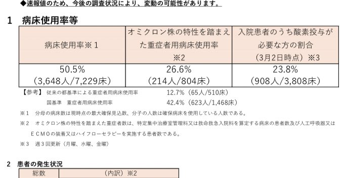 東京都は独自基準で誤魔化す汚さ。3/4だと、重症者数65人に対して国基準では635人と10倍近くになる。 https://twitter.com/nikku817/status/1499724456658305024 …