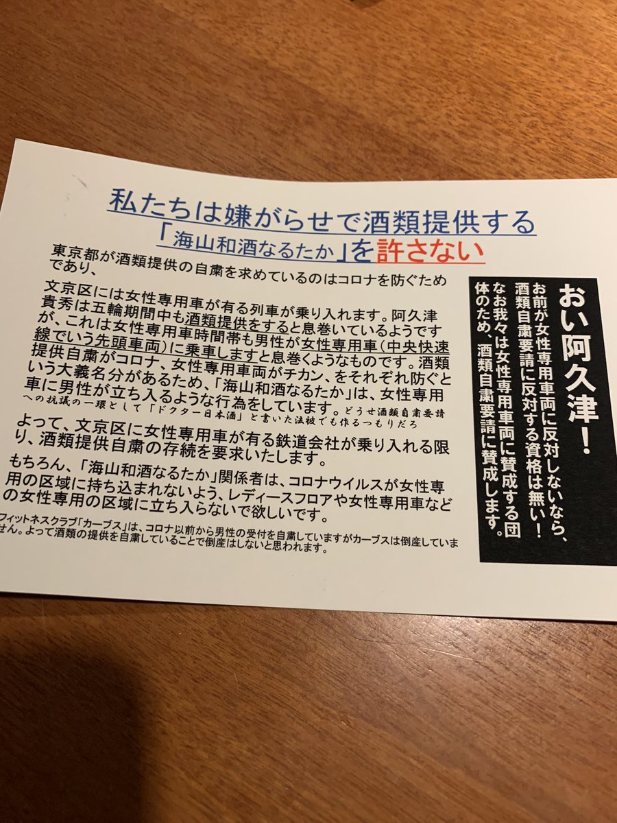 匿名がどうこうとか緊急事態宣言下の酒類提供がどうこうとかいう以前に、内容が完全にキ○ガイのそれ https://twitter.com/takanoyaman7/status/1414420219351556098 …