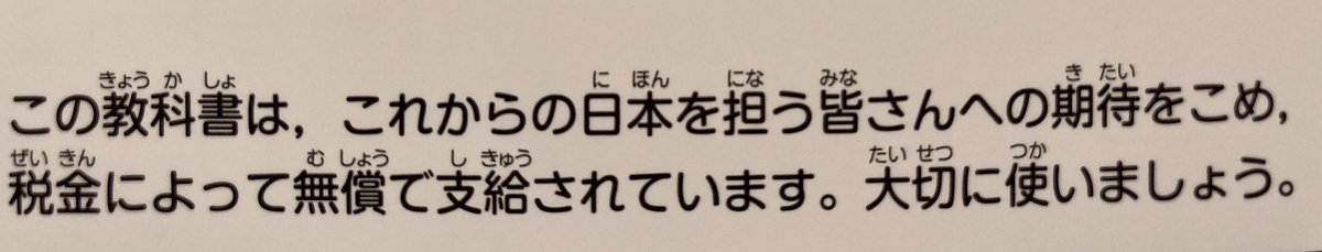 “교과서는 앞으로의 일본을 책임질 여러분에게 기대를 담아 세금을 통해 무상으로 지급되고 있습니다. 소중히 사용합시다.”