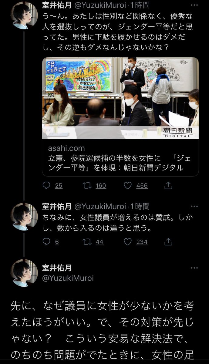 つかその主張は散々言ってたのに、室井氏ってとかく女性の数が少ないのが問題なのよ!キーッ!って言ってた人だよね。 https://twitter.com/inari_fox_08/status/1487381459774377985 …