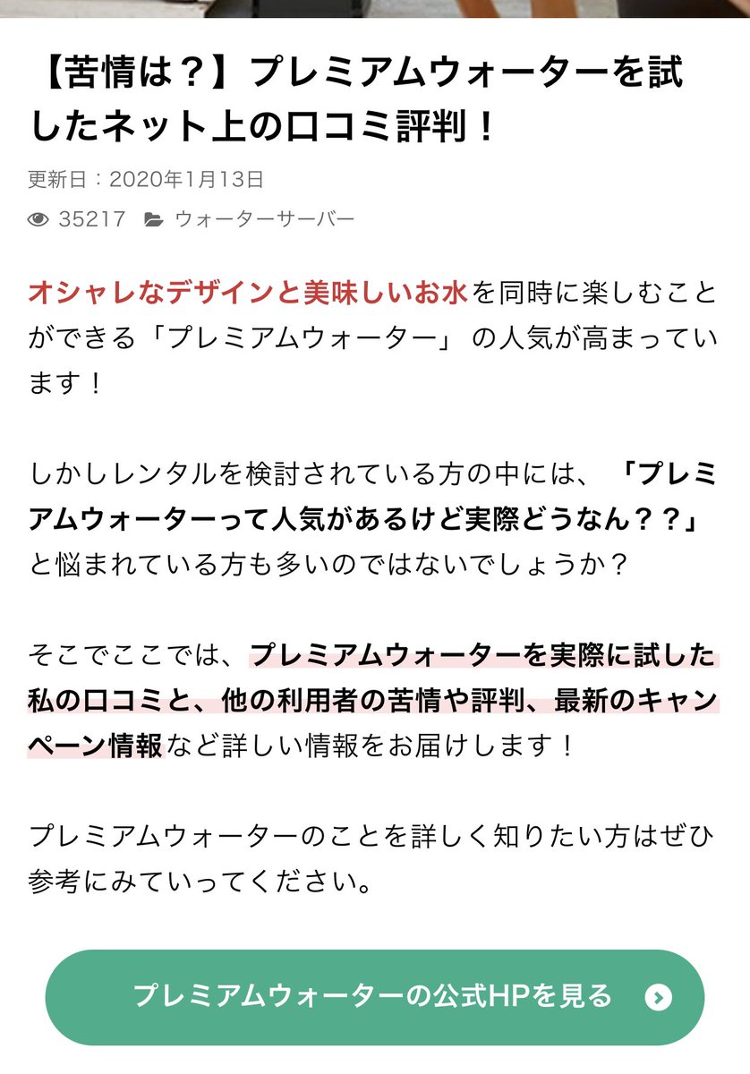 プレミアムウオーターで検索開くと次の予測変換は「苦情」「トラブル」「騙された」と出るけどページを開くとどれもそのワードが入っている企業側のちょうちん記事。