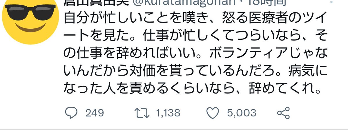 @hirokatz 健康強者の発想だなあ…。他の職種の人になら「キツければ辞めてもいいんだよ」と言いますが、目の前の苦しんでる患者や踏ん張っている仲間のことを見捨てられない人がほとんどでしょう。健康弱者の私としては感謝しかありません。