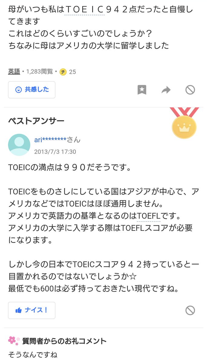 ツイッター 就活生ワイ「TOEICは999点です!」「俺も999点!」「俺も!」「俺は997点」 twitter 2022年7月4日 / 2022年7月4日 心動(こどう)@kodo2020062022/06/30 18:26:09TOEIC999点の学生が面接受けに来た。 とし@vK9rMfzv6vBv4no2022/07/01 15:25:46@kodo202006 999点という点数はない。満点は990 瀧25?@TAKI_ne_jp2022/07/01 16:02:04@kodo202006 うわぁー俺受けた時942点だったからギリ負けちゃった… 姫綺みなみ@Ug0Xt2022/07/01 15:09:51@kodo202006 未だにそんなアホおるんか一瞬天才かと思ったら満点超えだった嘘をつくのにも知識が必要だよね。 かっぺ@R4社労士受験生@syIkZ00Q72S5whe2022/07/01 15:15:36@kodo202006 まぁTOEICは全問正解じゃなくても990点になる場合があるしそれを考慮に入れて自分は全問正解で満点と言いたかった可能性はないな kz@johndoebythese12022/07/01 15:23:11@kodo202006 隠しポイントの9点しゅごい knox@knox_knox_ville2022/07/01 14:59:15@kodo202006 990かな 成瀬未来@dfyheryh2022/07/01 14:52:12@kodo202006 TOEICは990点満点だっけ…あと余計な9点ってなに?限界突破してて草ただのバカじゃん こっぺの思うこと ?@koppe_think2022/07/01 15:06:14@kodo202006 あと1点はケアレスミスしました とか言いそう 地雷屋ハイパーマルチメディアクリエイト店@なぜか上海@mine__02022/07/01 14:59:03@kodo202006 @yamadacorwen あと1点たりなかったか〜。 播州人??NO WAR?@2020reborn2022/07/01 15:06:02@kodo202006 TOEICって990点までだったくない?ほぇ??! MASA@175rider@masa_175rider2022/07/01 15:14:52@kodo202006 RPGゲームのレベル上げしきったHP数かよ(笑) 無能 乃人@munoujin2022/07/01 15:34:56@kodo202006 9点…どこから調達したのか是非ご確認いただきたいです? 坪井 眞剛@shingo_tsuboi2022/07/01 15:22:10@kodo202006 世界初ですねw 結石結石@v55wutxugMs5Hv62022/07/01 15:28:43@kodo202006 俺はTOEIC八段でいこうかな? うぱー(司法試験予備試験)@YUKINEXMK22022/07/01 15:16:13@kodo202006 実は名前欄に9点配点あること知らずに受けてる人多いよねw たはや??@0120ECLIPSE2022/07/01 15:26:24@kodo202006 俺もielts10持ってる mikya@mikya729635142022/07/01 15:32:29@kodo202006 まさかの満点超え!何が加点されたのか!? ロンドンの日本大使館にキレてます@Hyuk_392022/07/01 15:28:15@kodo202006 999点なんて存在しません てってれー@1137xyz2022/07/01 15:31:01@kodo202006 限界突破した学生ですね!!!! Hold@Hold815525172022/07/01 15:45:43@kodo202006 ツッコミ不在 pic.twitter.com/DavkQBYJtB Donald Dick@DonaldDickLong12022/07/01 15:33:59@kodo202006 TOEIC満点より、英検1級取得の方が難しいんじゃなかったかな?どうでもいいけど Soraneko@Soranekofuyuki2022/07/01 15:33:36@kodo202006 何点とったかを証明してもらえばいいんですよ、そういう時は(笑)スマホでも何でいいので、実際の得点を見せてくださいって(๑•̀ㅂ•́)و✧ 穂南みみこ@hT5O3bxQ4wLvMSb2022/07/01 15:39:43@kodo202006 あと余計な9点ってなに?990点満点のTOEICあきらかに捏造資格やなwww きっちゃん@JD62T7LeYhG1ZDJ2022/07/01 15:43:01@kodo202006 嘘つき野郎 first down@keihanmall2022/07/01 15:42:22@kodo202006 英語が出来るのと、仕事が出来るのとは全く違うからなぁ far away eyes さ@McL_lol2022/07/01 15:56:15@kodo202006 なんか本気でわかってなさそうな人多くて草 honhon@honhon061992132022/07/01 15:47:14@kodo202006 細けえことは良いんだよ ダッチロール(ヤニカス)@DUCCI_spoon2022/07/01 15:47:05@kodo202006 5点刻み… サケナオ@090azNMPBACWXMt2022/07/01 15:57:10@kodo202006 おしい!!あと1点! 吉田飛翔@PsjazO2022/07/01 15:53:09@kodo202006 TOEICで999点….あっ(察 土方十四郎 声優名高須竜司(田中裕也)/土方十四郎(本人)ゆうちゃん(L・パープル)cpn冥(絶兎)@h4He4uX04fgKvGD2022/07/01 16:09:03@kodo202006 こないだ999で止めたやつ ですよね? 行ってません… レアンテ@IF_Leante2022/07/01 16:06:40@kodo202006 あれなんで5点刻みなんだっけ? rrr@y3eZmdGmlcv1Ksj2022/07/01 16:07:12@kodo202006 私は数年前に満点の1000点を取ったことがあります先日受けたのは997点でした