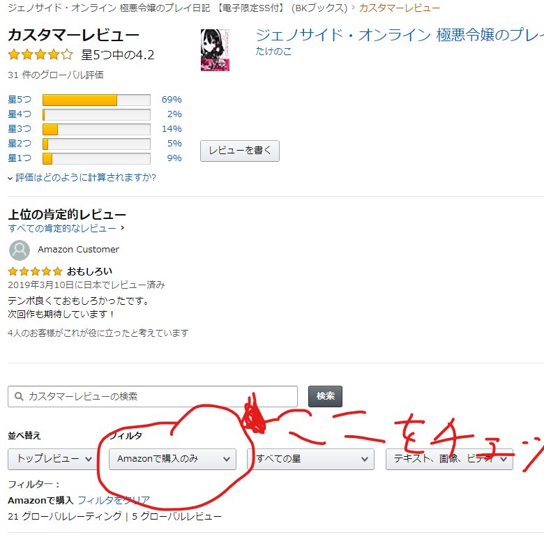 Amazonレビューをフィルタから「Amazonで購入した人のみ」に出来ると読者さんに教えて貰ったので、自作の『ジェノサイド・オンライン』で試しにやってみたら見事に私個人に対する人格攻撃が消えたどころか星5レビューしか残らなかったという、衝撃の事実が現れて行き場のない感情が生まれてしまった。