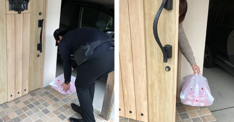 配達員はデリバリー先到着後、インターホン越しで注文内容、グリーンチリソースの有無、ピザの置き場所を確認し、利用者が指定した場所に袋に入った商品を置く。利用者は置かれたピザを、室内に持ち込む。