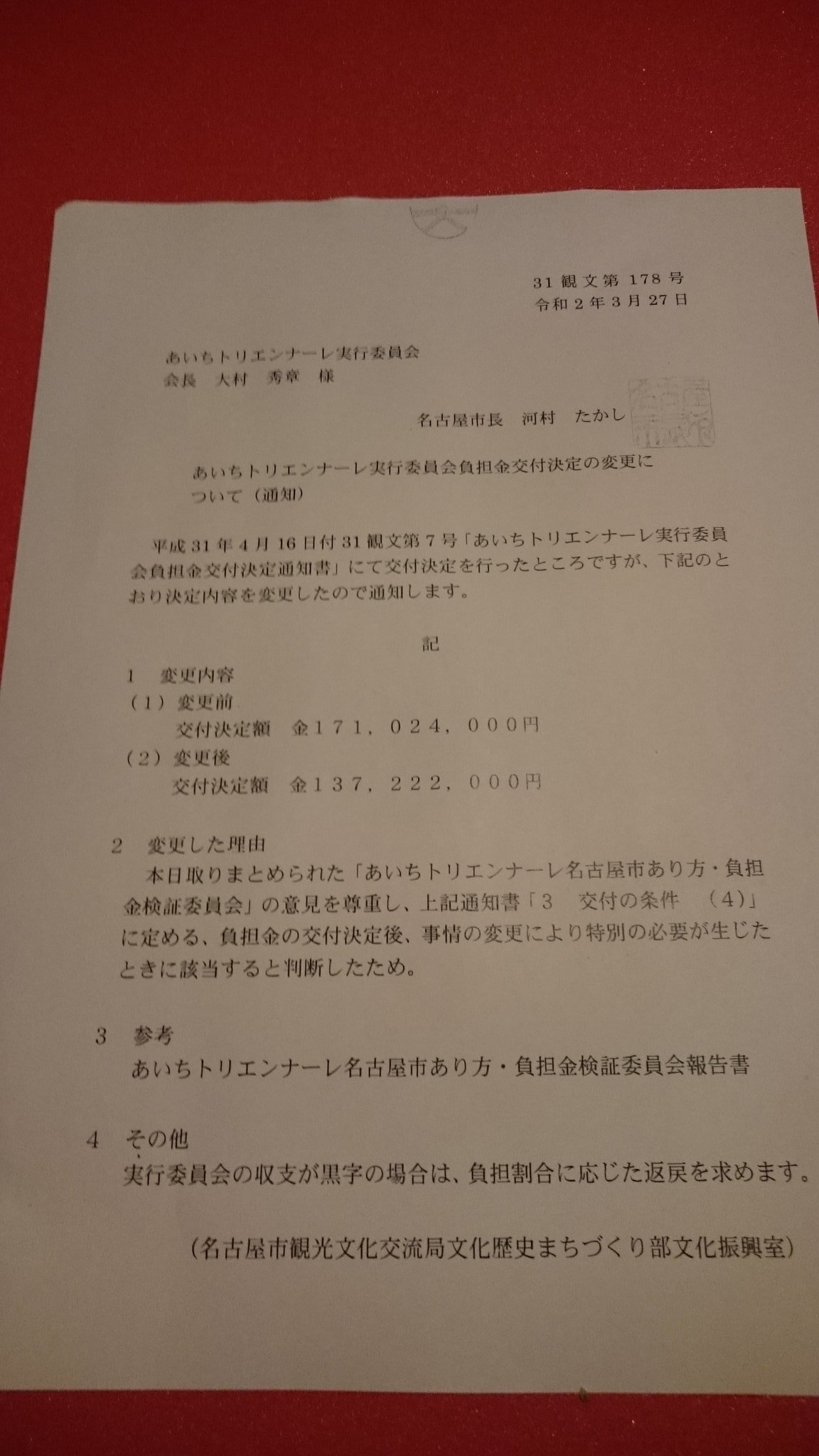 自力入力 今日 さきほど 名古屋市トリエンナーレ負担金について twitter添付文章のように、未払い分(全額33,802,000円)について、名古屋市トリエンナーレ検証委員会のご意見を尊重し、不払いとすることを 名古屋市として正式に 決定しました。皆さんへのこ連絡ですがね。